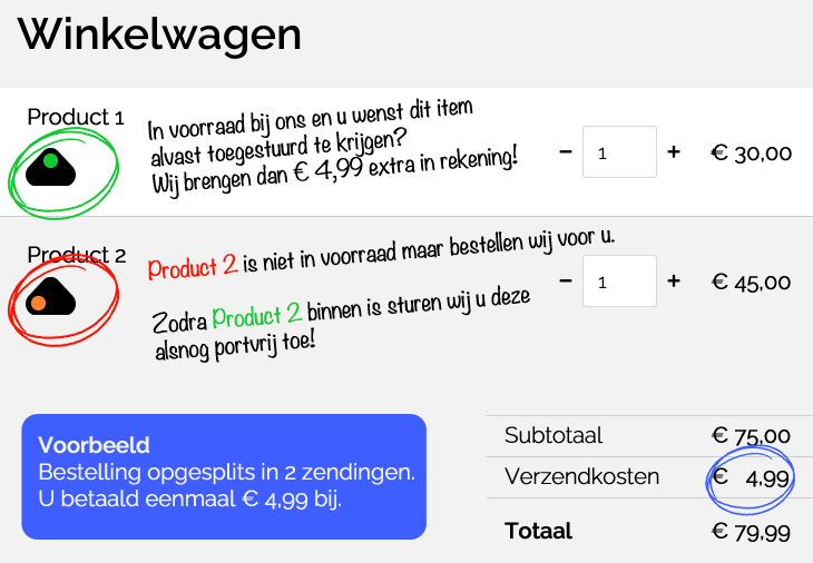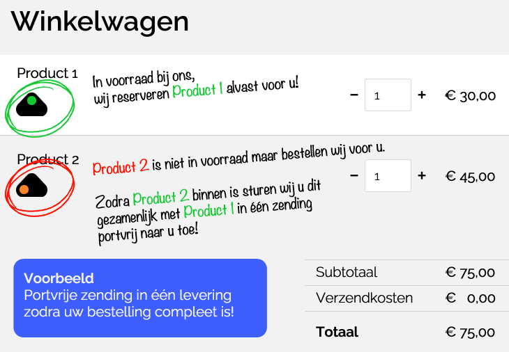 Dan sturen wij de aanwezige items direct naar u toe en de backorders (waaronder noviteiten) indien gewenst bij binnenkomst portvrij toe. Kortom u geniet meerdere zendingen zonder extra verzendkosten.