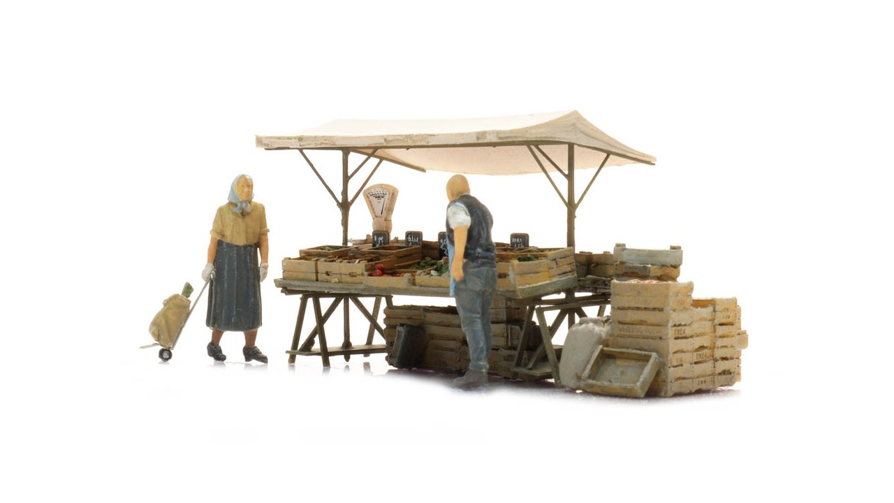 Marktkraam groenten met figuren